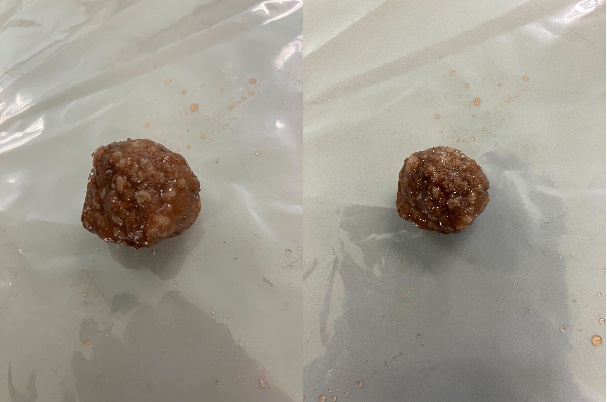 ミートボールは油で揚げた後にソースと一緒に袋詰めされます。揚げ工程でなんらかの原因により過度に揚げられてしまったものと思われます。ご確認させていただきたいので、お手数ですが現物と袋を保管のうえ、カスタマーサポートへお電話ください。