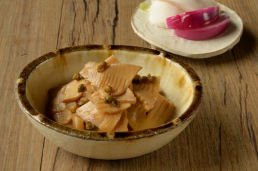 その色の白さから「白たけのこ」と呼ばれ、苦み、えぐみの少ない千葉県大多喜町のたけのこ。 味付けには地酒の「大多喜城」と、千葉県醸造の醤油を使用。だしには枕崎産本枯節とまぐろぶしの他、筍のひめ皮からもだしを取っており、筍の風味を最大限に引き出した一品です。